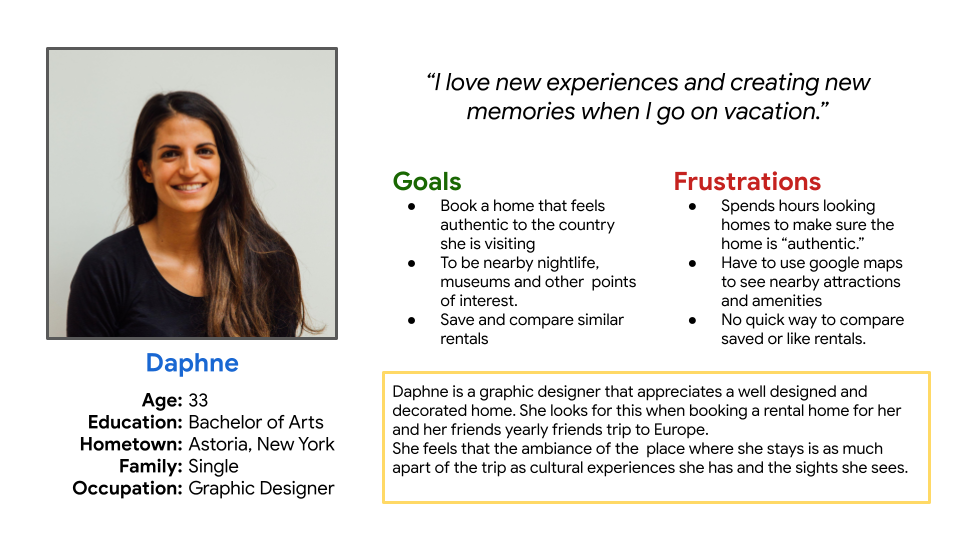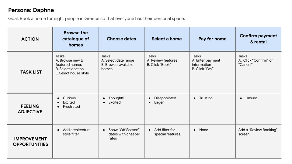 Mapping Daphne’s user journey showed a need to show pricing upfront and special filters to find the right kind of rental home.