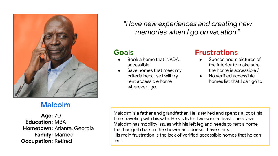 Malcolm is a retiree with a disability that reduces his mobility and needs to rent an accessible vacation home because he has trouble going up and down stairs and getting into and out of the shower without help.