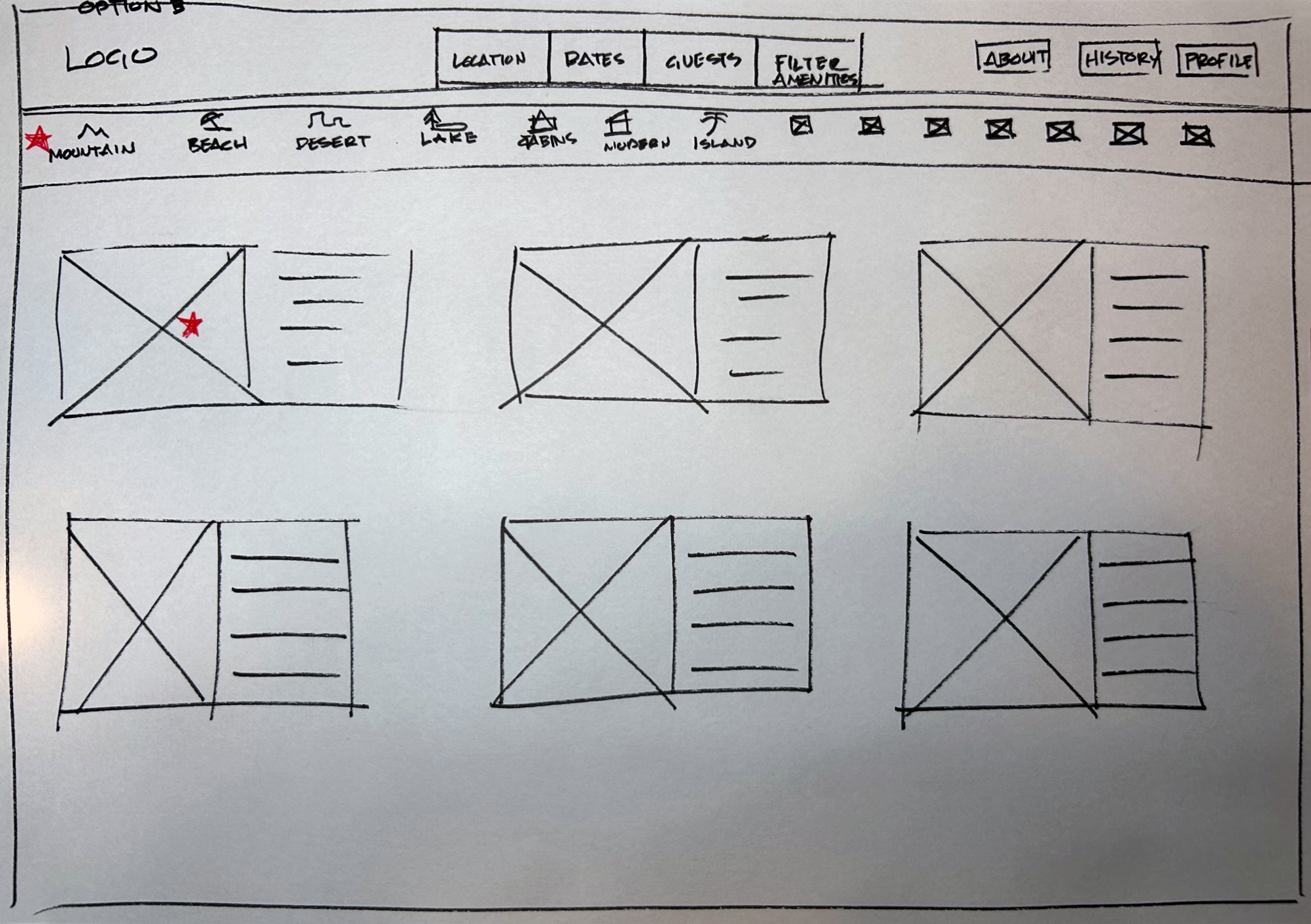 The home screen paper wireframe variations to the right focus on optimizing the browsing experience for users.