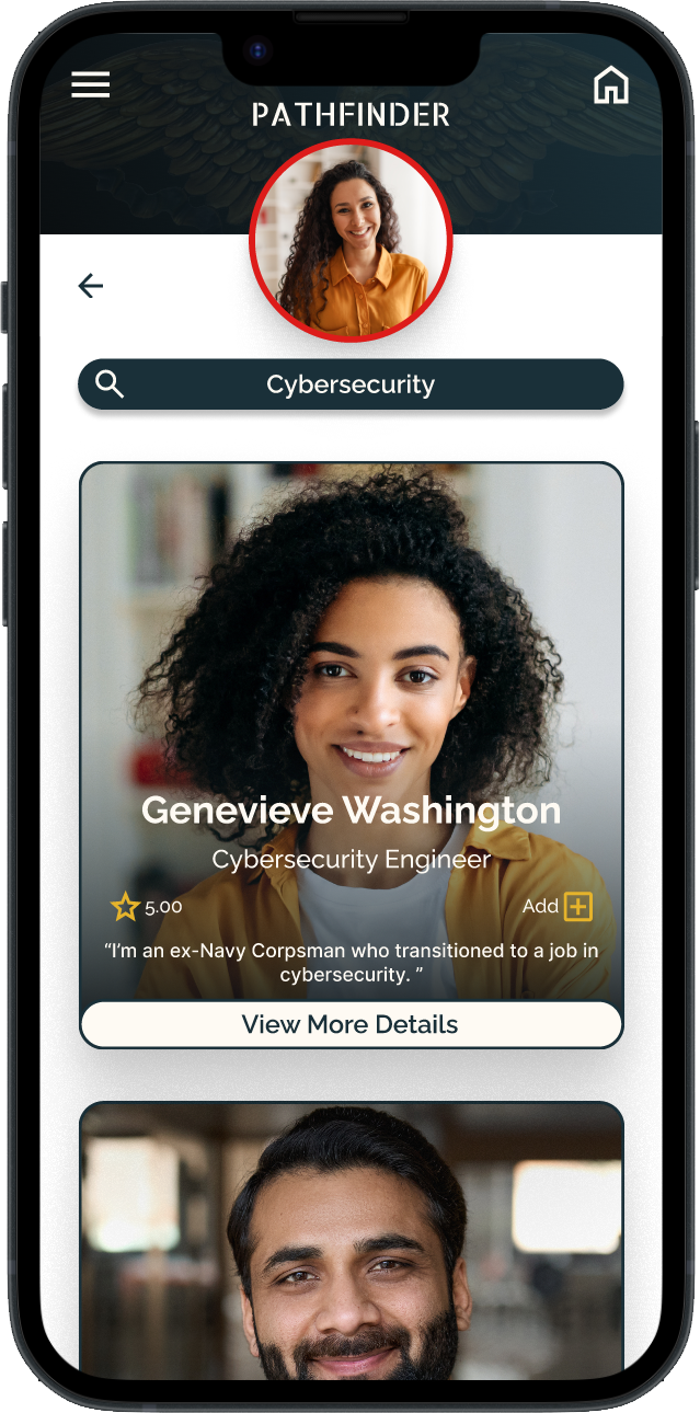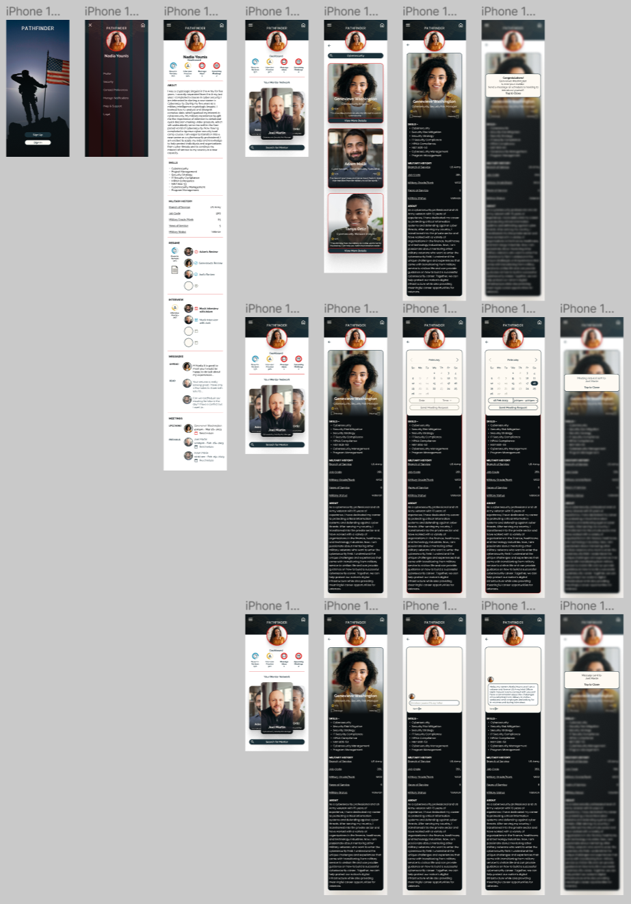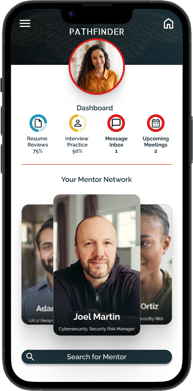 The app is designed to help veterans find mentors who are also veterans to assist them in transitioning into the civilian workforce. The app aims to connect veterans with mentors who can provide guidance and support as they navigate the challenges of finding employment after serving in the military. Pathfinder’s primary target users are all veterans, but primarily recently separated veterans.