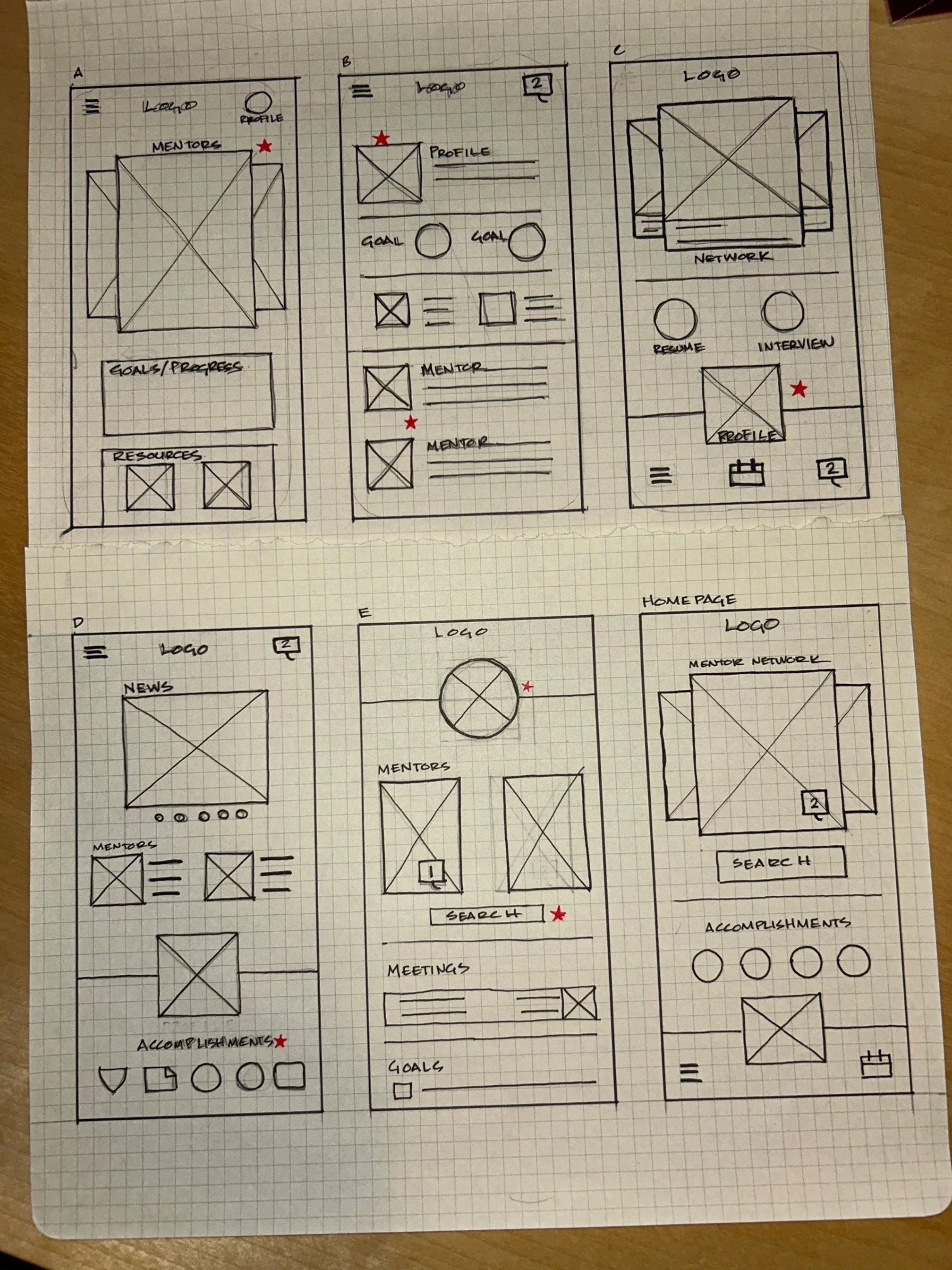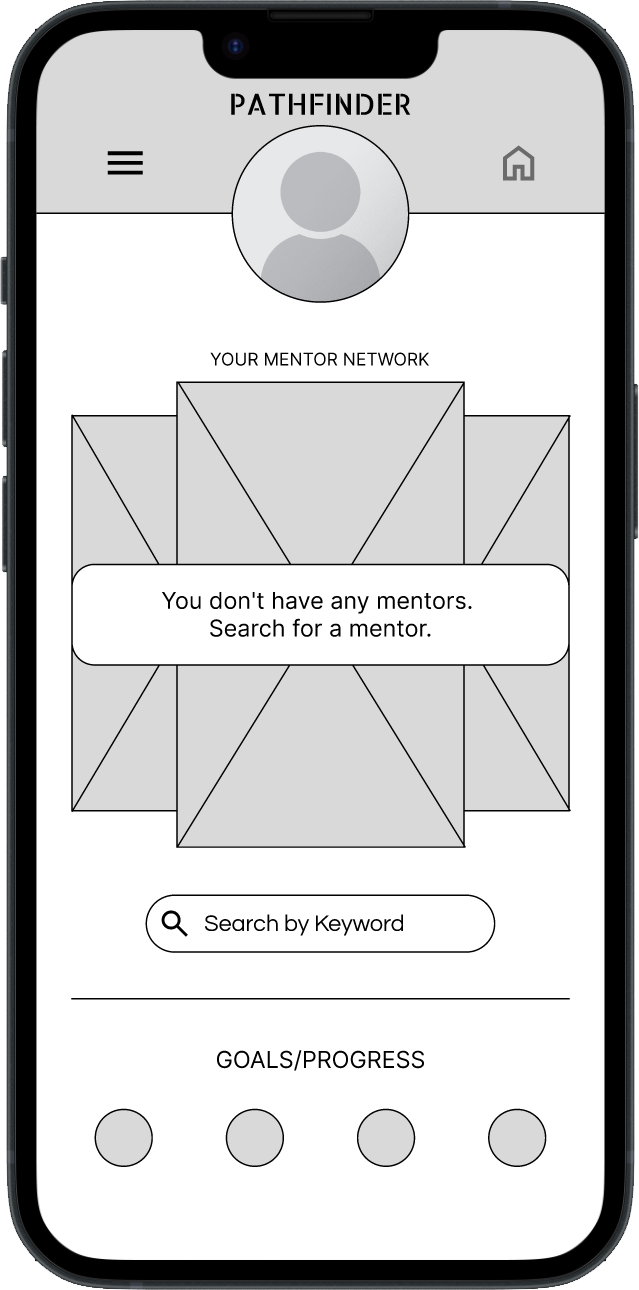 After ideating and drafting some paper wireframes, I created the initial designs for the Pathfinder app. These designs focused on the primary functions of interacting with mentors and managing the user’s progress toward goals